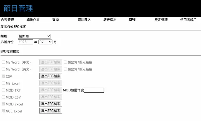 系統支持多種電子節目表格式的匯出,包括 MOD 和 NCC 等格式,滿足不同平台的需求。無論是電視播出還是網路節目,這套系統都能讓您的節目表排程更簡單、更高效,助您輕鬆應對各種播映要求。選擇我們的 EPG 解決方案,讓您的節目管理更靈活!