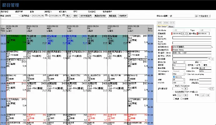 節目編排作業依序可分為編排、檢查(Check)、定版(Rel)及輸出(Export)四種步驟,此處介紹節目編排作業。節目編排主界面分節目架構編輯區及區塊內容資料區。架構區內一格塊稱為一節目區塊;於架構區增刪改、複製貼上編排作業。架構區右方為節目區塊內容細目。節目架構除能編排各別節目區塊外,也可以一次性的建立有次序順序連續性節目區塊,即群組區塊,常見於帶狀線節目的編排。