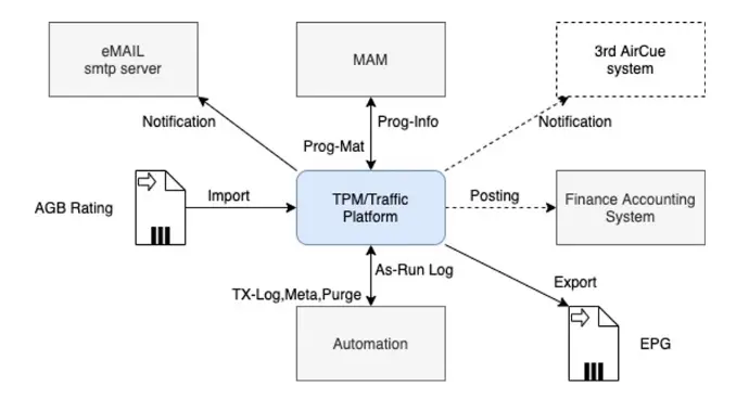 系統整合至:主控系統、媒資片庫、電視廣告託播系統