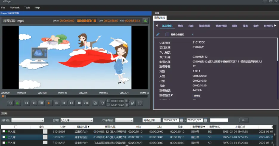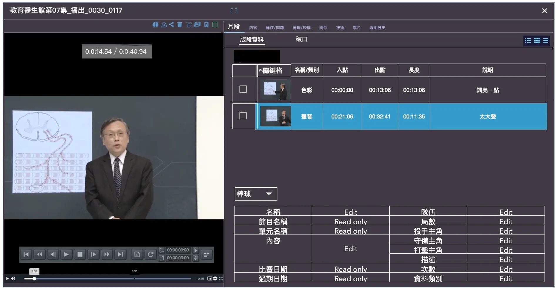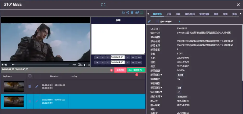 影片片段資料:Segment metadata by manual mark-in/out key-in