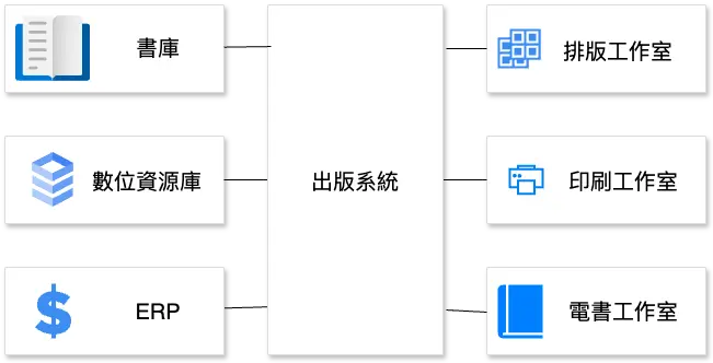 系統整合:排版工作室、印刷工作室、媒資庫、書庫、ERP、電子書工作室